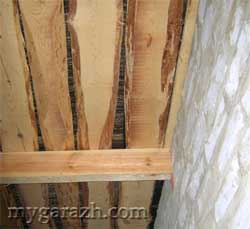 У першу чергу необхідно встановити балки, вони можуть лежати як поперек, так і уздовж гаража (правильне розташування це уздовж гаража, а поперек, в данному випадку, нічим ні гірше). Товщина балок повинна розраховуватися з розрахунку її довжини, для довжини біля чотирьох метрів, буде досить балки з перетином 50-60 мм. Відстань між балками повинне бути не більше 1 метра. Після установки балок їх необхідно зафіксувати до стін гаража, найкращим рішенням буде фіксування балок у підготовлений проріз із наступною закладкою цеглою.